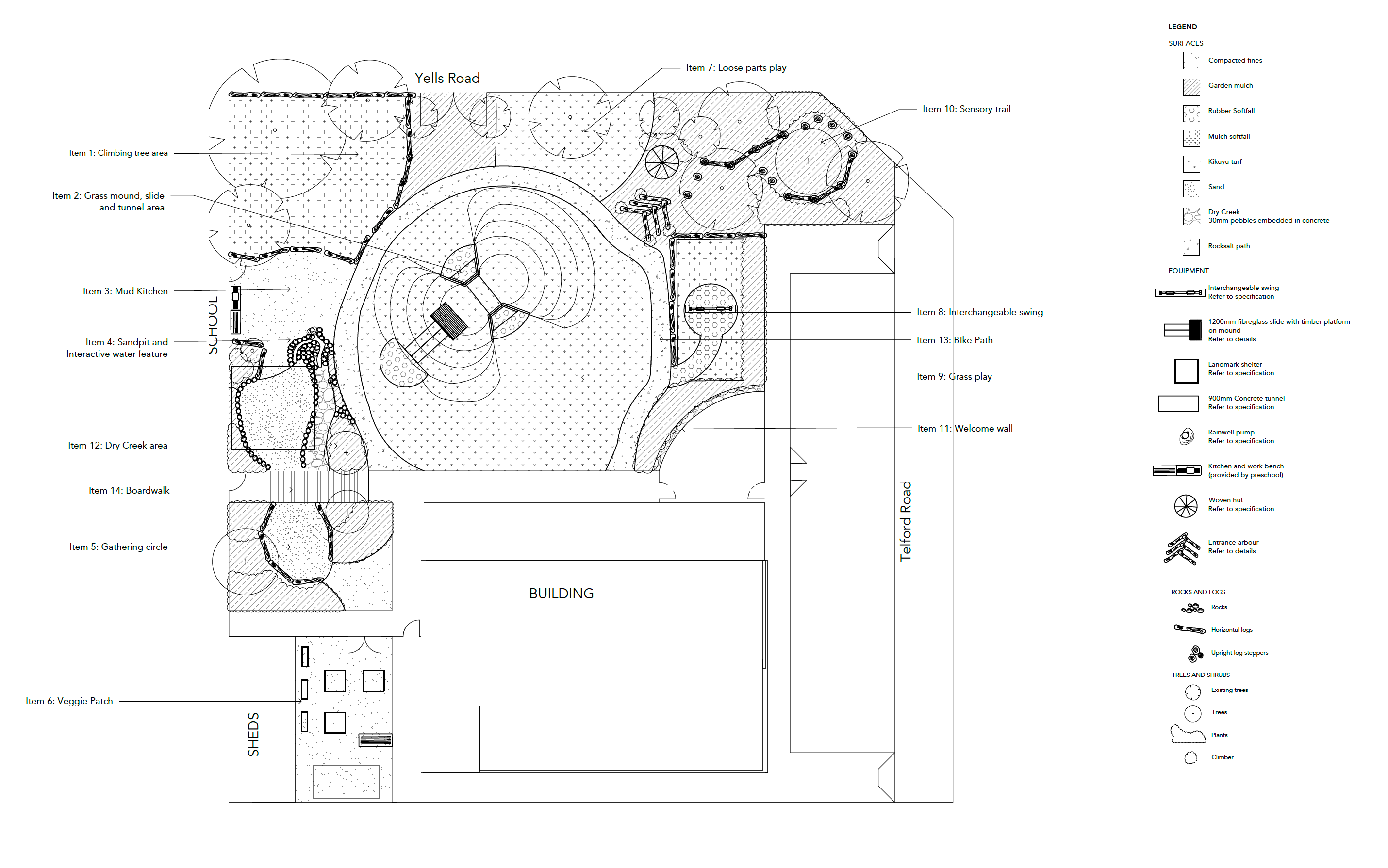 Item 7: Loose parts : Retain existing trees. Natural turf and mulch ground surfacing for loose parts construction.
